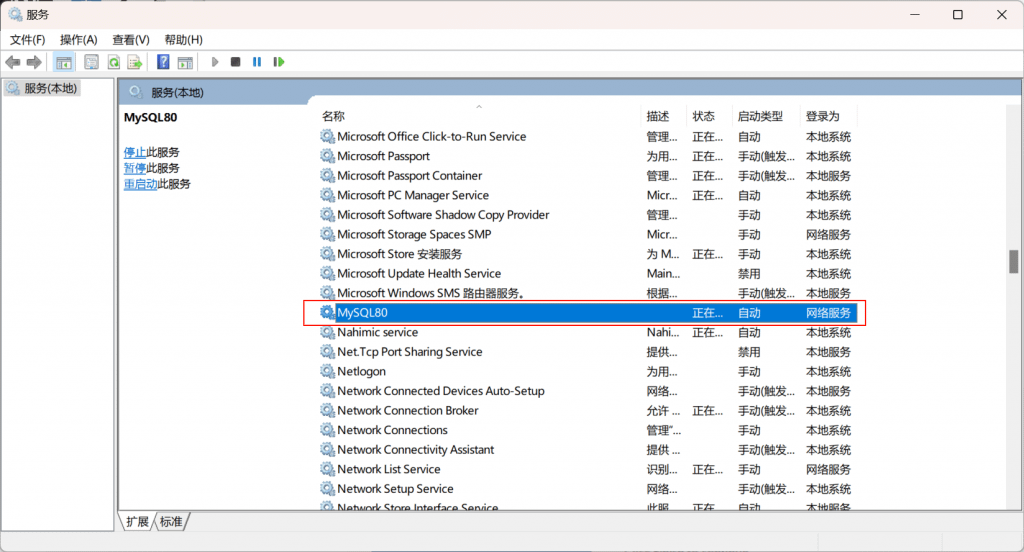 服务列表中MySQL80的服务状态应该是正在运行,启动类型应该是自动