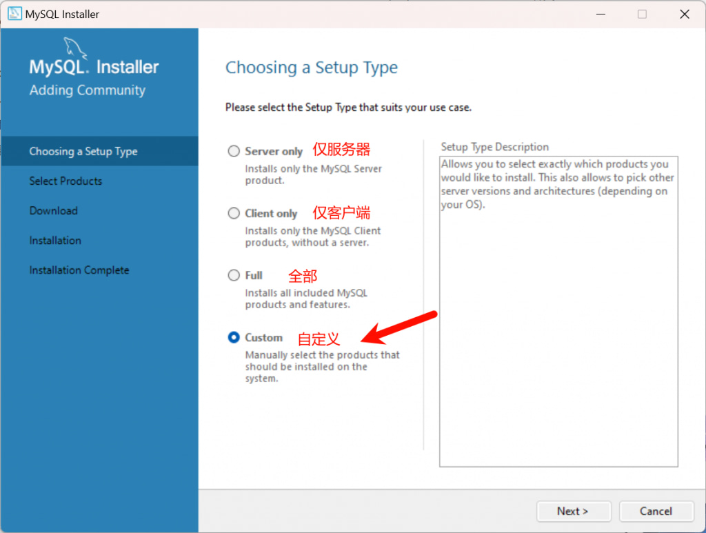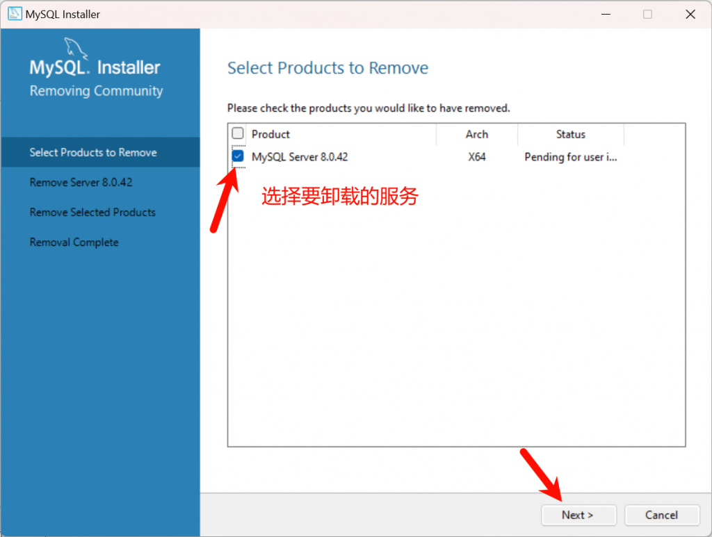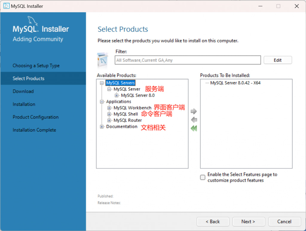 仅需安装服务端即可,点击MySQL Server 8.0左边的+号,选择安装的版本,点击中间的第一个右箭头,下一步。