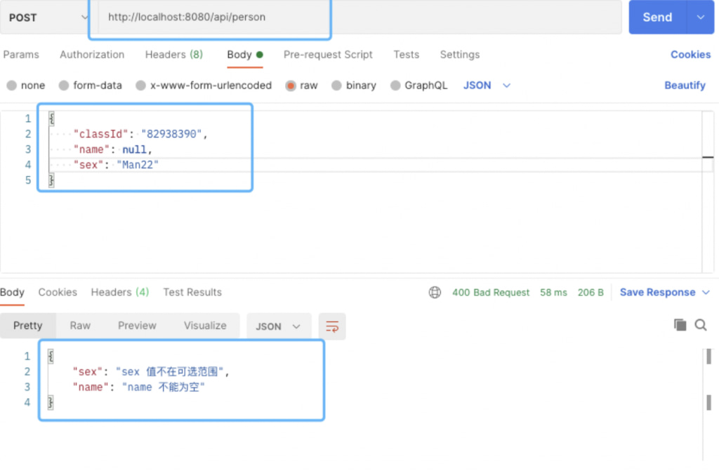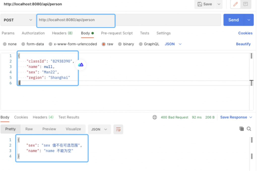 我们在需要验证的参数上加上了注解,如果验证失败,它将抛出。默认情况下,Spring 会将此异常转换为 HTTP Status 400(错误请求)。@Valid MethodArgumentNotValidException