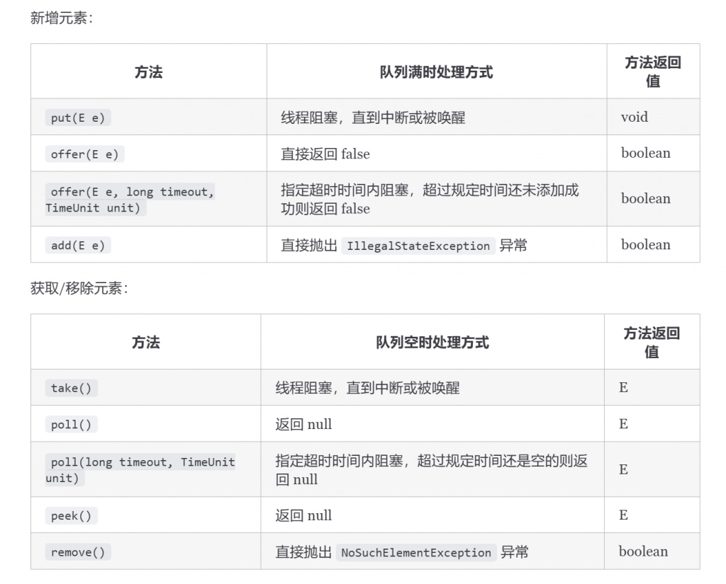 put(E e):将元素插入队列中,如果队列已满,则该方法会一直阻塞,直到队列有空间可用或者线程被中断。take():获取并移除队列头部的元素,如果队列为空,则该方法会一直阻塞,直到队列非空或者线程被中断。