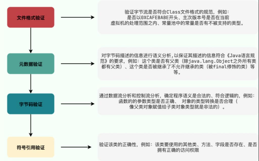 验证是连接阶段的第一步,这一阶段的目的是确保 Class 文件的字节流中包含的信息符合《Java 虚拟机规范》的全部约束要求,保证这些信息被当作代码运行后不会危害虚拟机自身的安全。