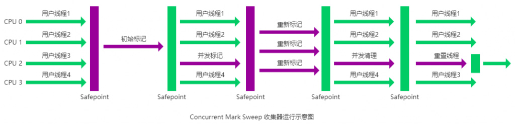 从名字中的Mark Sweep这两个词可以看出,CMS 收集器是一种 “标记-清除”算法实现的,它的运作过程相比于前面几种垃圾收集器来说更加复杂一些。整个过程分为四个步骤: