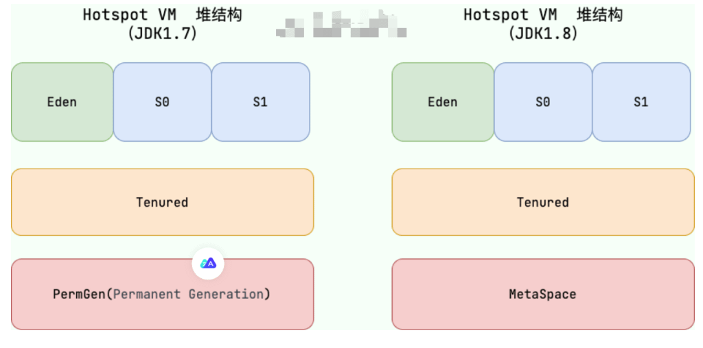 - JDK1.8 hotspot 移除了永久代用元空间(Metaspace)取而代之, 这时候字符串常量池还在堆, 运行时常量池还在方法区, 只不过方法区的实现从永久代变成了元空间(Metaspace)
