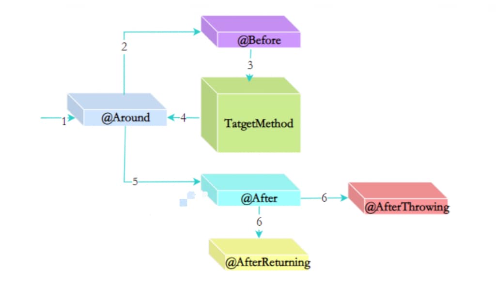 @After:在方法执行之后执行(方法上)。@Before: 在方法执行之前执行(方法上)。@Around: 在方法执行之前与之后执行(方法上)。@PointCut: 声明切点 在java配置类中使用@EnableAspectJAutoProxy注解开启Spring对AspectJ代理的支持(类上)。