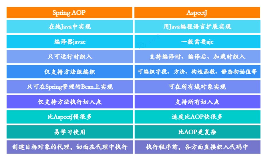 - 在性能上,由于 Spring AOP 是基于动态代理来实现的,在容器启动时需要生成代理实例,在方法调用上也会增加栈的深度,使得 Spring AOP 的性能不如 AspectJ 的那么好。