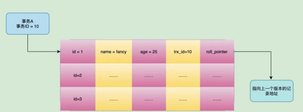 那么这个roll_pointer就是存储了一个指针,这个指针是一个地址,指向这个聚簇索引的上一个版本的记录位置,通过这个指针就可以获得到每一个历史版本的记录。