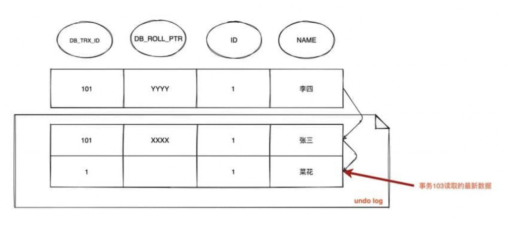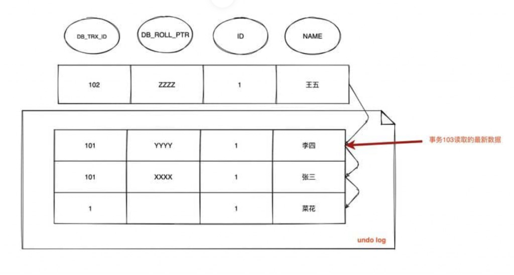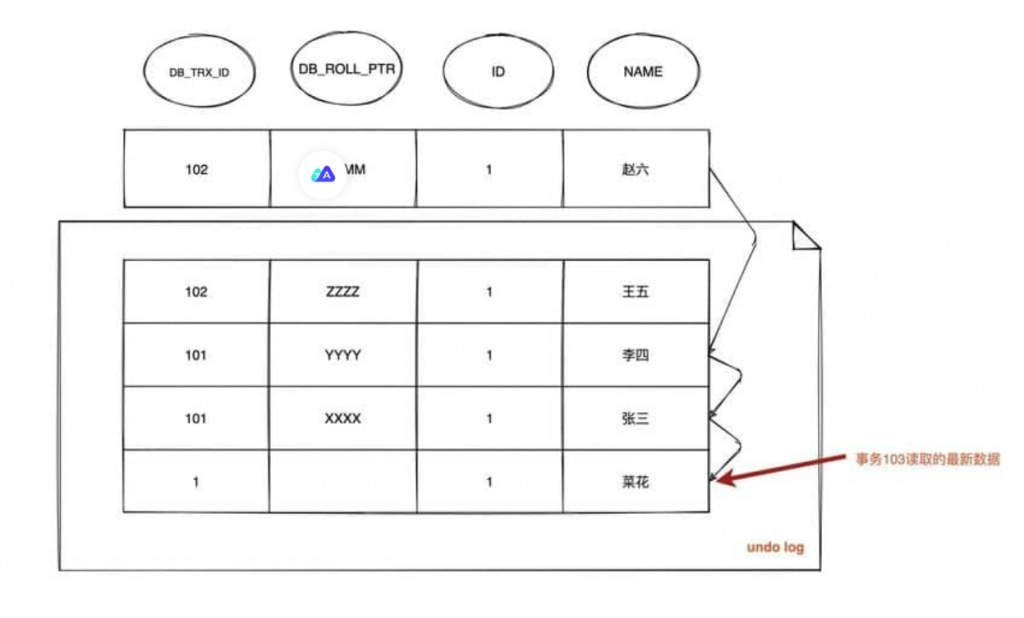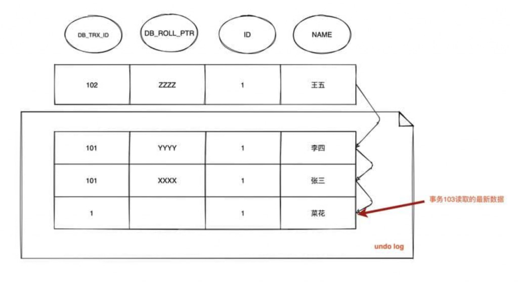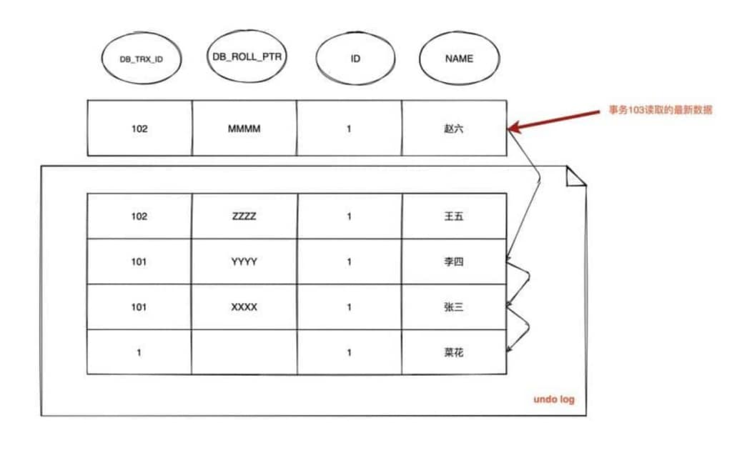 DB_ROLL_PTR找到undo log中的上一版本记录,上一条记录的DB_TRX_ID还是 101,不可见 - 继续找上一条
