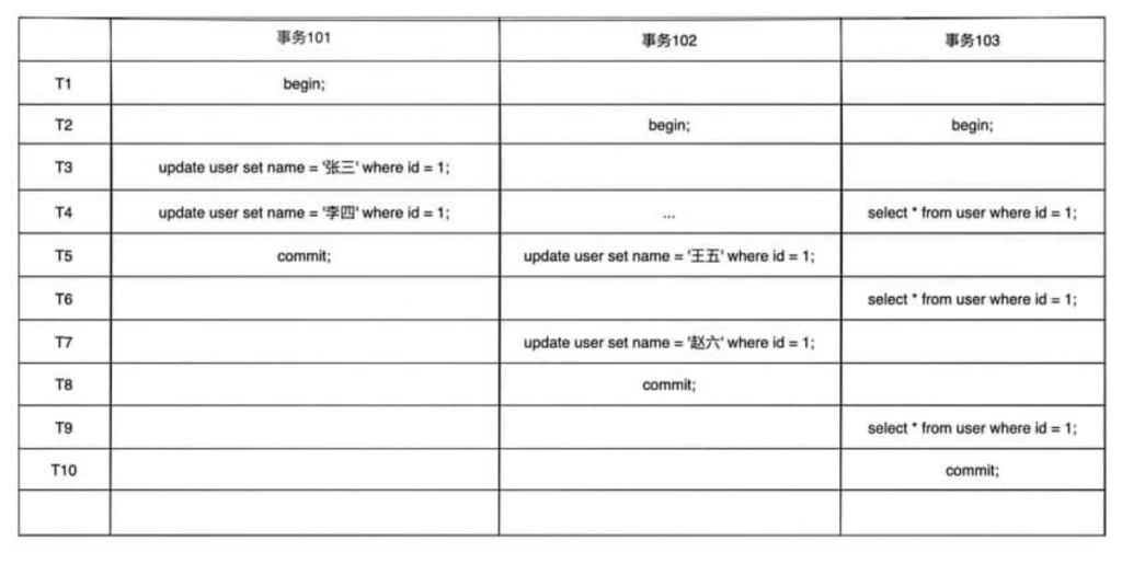 DB_ROLL_PTR找到undo log中的上一版本记录,上一条记录的DB_TRX_ID为 101,满足 101 < m_up_limit_id,记录可见,所以在T6时间点查询到数据为name = 李四,与时间 T4 查询到的结果不一致,不可重复读!
