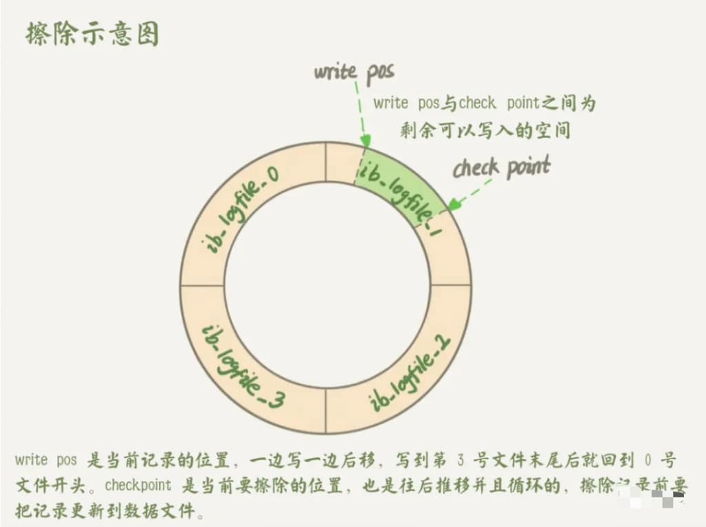 write pos是当前记录的位置,一边写一边后移,写到第3号文件末尾后就回到0号文件开头。checkpoint是当前要擦除的位置,也是往后移动并且循环的,擦除记录前要把记录更新到数据文件,write pos与check point之间为剩余可用写入的空间。