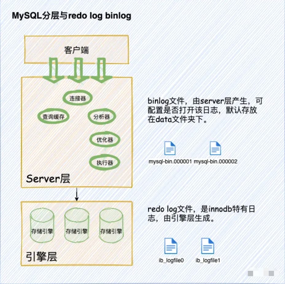 MySQL整体分为3层:客户端层,Server层和存储引擎层。我们的binlog日志,由Server层生成,redo log是InnoDB特有的日志,由InnoDB引擎生成。