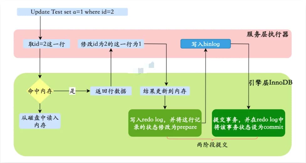 从上图可以看出,MySQL在执行更新语句的时候,在服务层进行语句的解析和执行,在引擎层进行数据的提取和存储;同时在服务层对binlog进行写入,在InnoDB内进行redo log的写入。