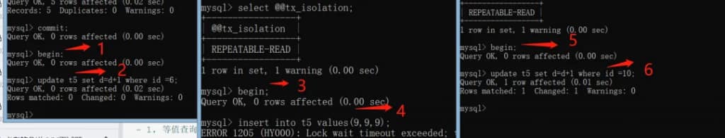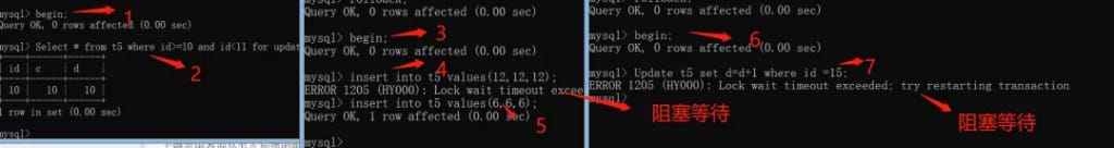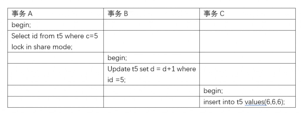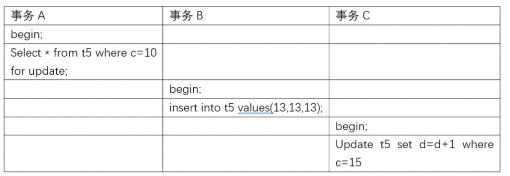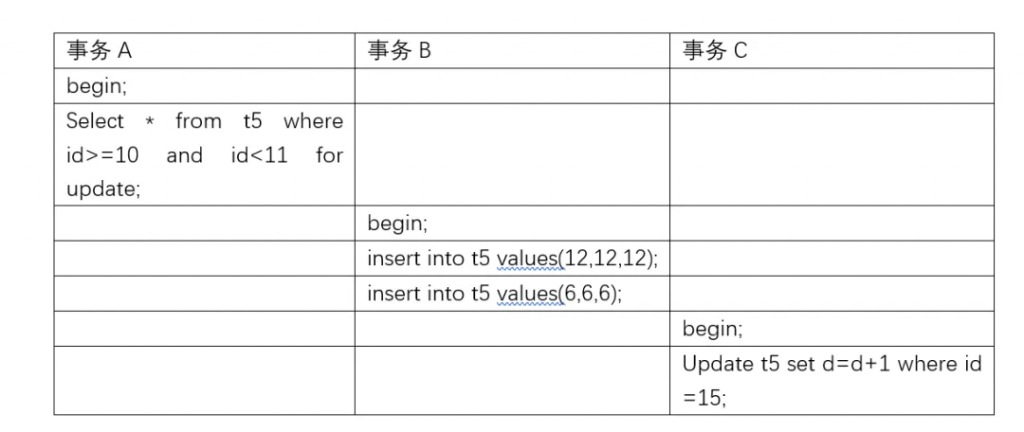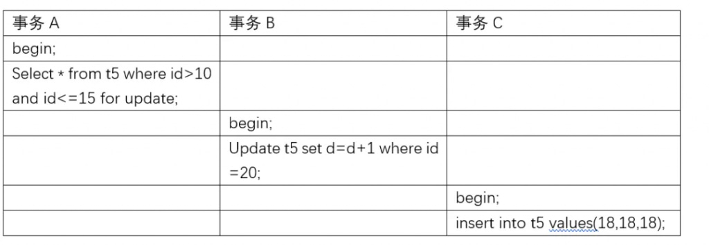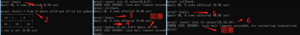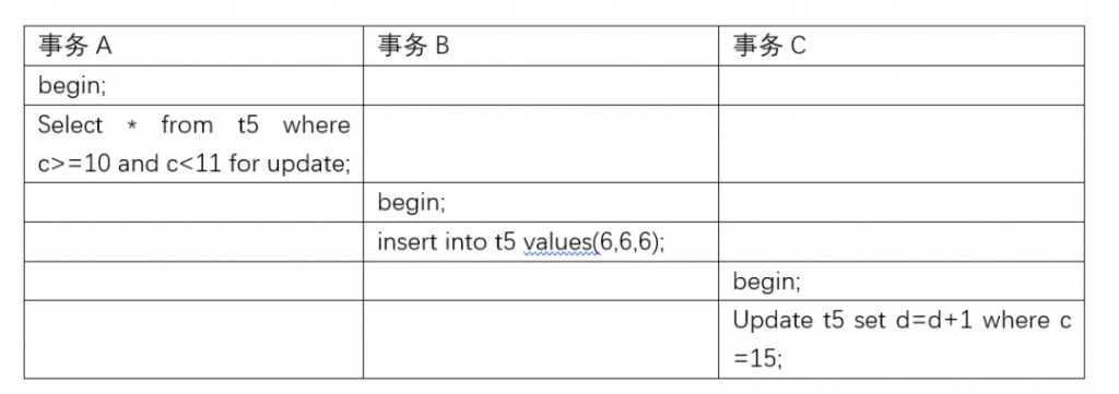 因此事务B和事务C插入的insert into t5 values(6,6,6);和Update t5 set d=d+1 where c =15; 都会阻塞。
