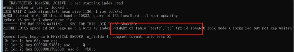 RECORD LOCKS space id 268 page no 3 n bits 72 index PRIMARY of table `test2`.`t6` trx id 1644867 lock_mode X locks rec but not gap waiting