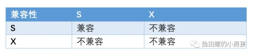 如果T1持有行R的X锁,那么T2请求R的X、S锁都不能被立即允许,T2 必须等待T1释放X锁才可以,因为X锁与任何的锁都不兼容。