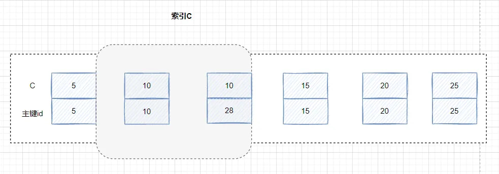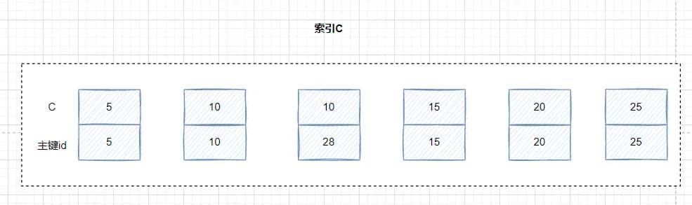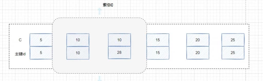 索引值有相等的,但是它们对应的主键是有间隙的。比如(c=10,id=10)和(c=10,id=28)之间。