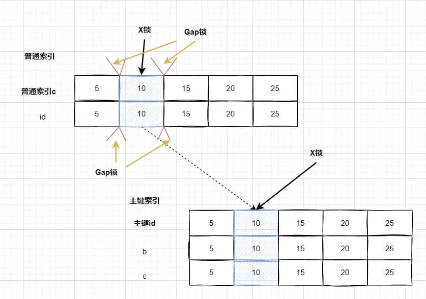 (c=10,id=10) 到 (c=15,id=15)的间隙Gap锁。即事务会话A这个select...for update语句在索引 c 上的加锁范围,就是下图灰色阴影部分的: