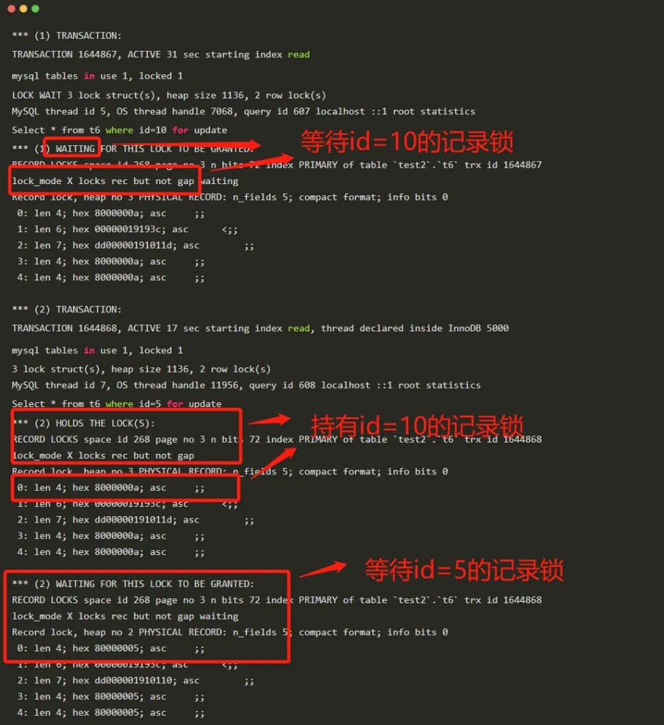 TRX HAS BEEN WAITING 7 SEC FOR THIS LOCK TO BE GRANTED表示它在等这个锁RECORD LOCKS space id 267 page no 4 n bits 80 index c of table `test2`.`t5` trx id 1644853 lock_mode X locks gap before rec insert intention waiting表示一个锁结构,这个锁结构的Space ID是267,page number是4,n_bits属性为80,对应的索引是c,这个锁结构中存放的锁类型是X型的插入意向Gap锁。0: len 4; hex 8000000a; asc ;;对应加锁记录的详细信息,8000000a代表的值就是10,a的16进制是10。TABLE LOCK table `test2`.`t5` trx id 1644853 lock mode IX表示一个插入意向表锁