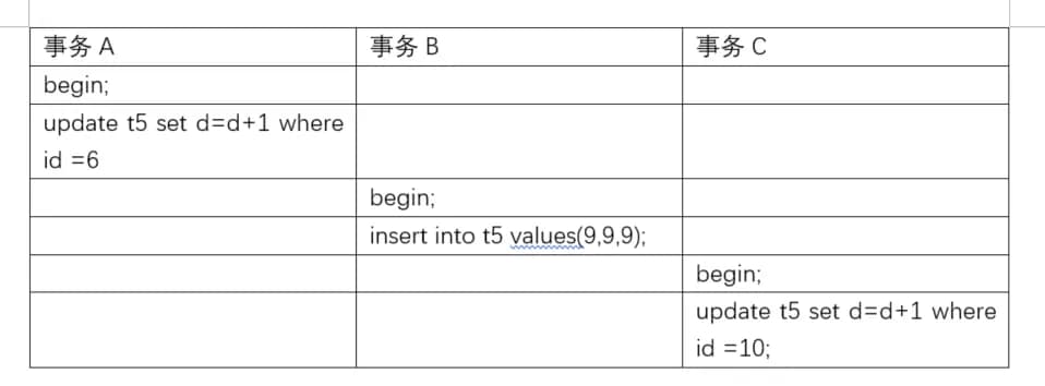 我们来看个例子,按顺序执行事务会话A、B、C,如下: