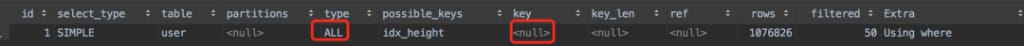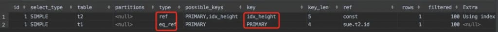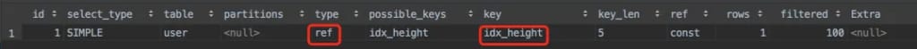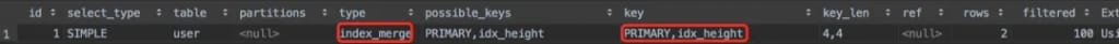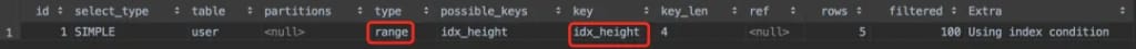 id字段本身是有主键索引的,同时height字段也建了普通索引的,并且两个字段都是int类型,类型是一样的。