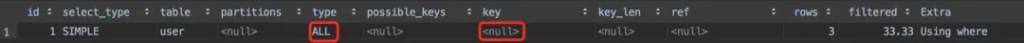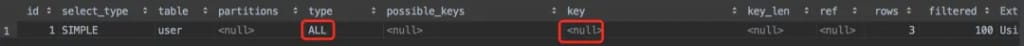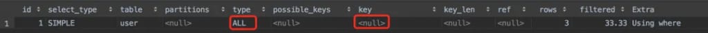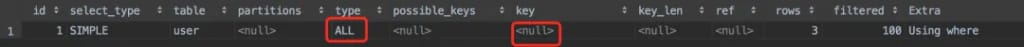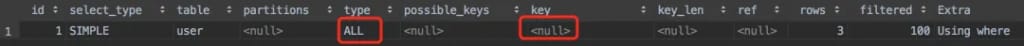 在该sql中用了select *,从执行结果看,走了全表扫描,没有用到任何索引,查询效率是非常低的。