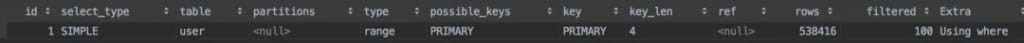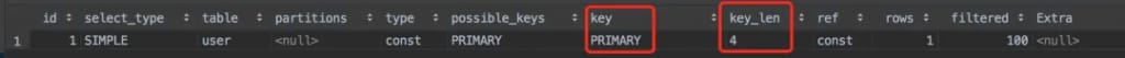 从图中可以看出,由于id字段是主键,该sql语句用到了主键索引。