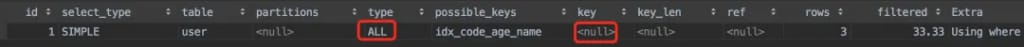你会惊奇的发现,该sql语句竟然变成了全表扫描。因为少写了引号,这种小小的失误,竟然让code字段上的索引失效了。