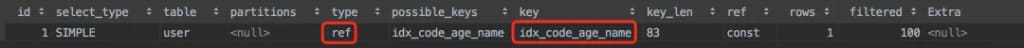 code是联合索引的第一个字段,在where中使用了,而age是联合索引的第二个字段,在order by中接着使用。