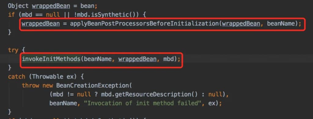 决定他们调用顺序的关键代码在AbstractAutowireCapableBeanFactory类的initializeBean方法中。