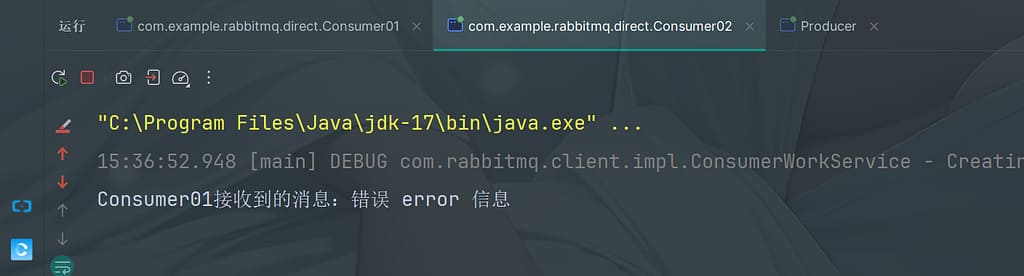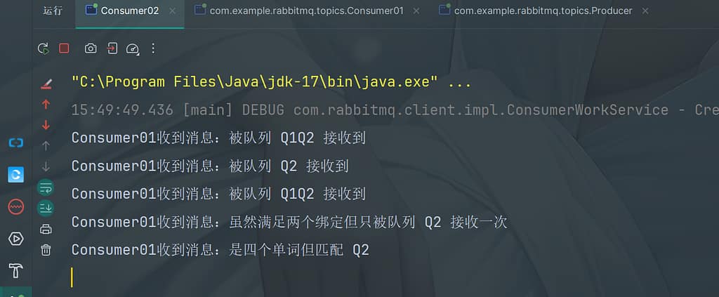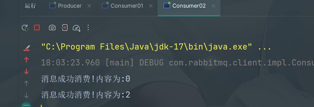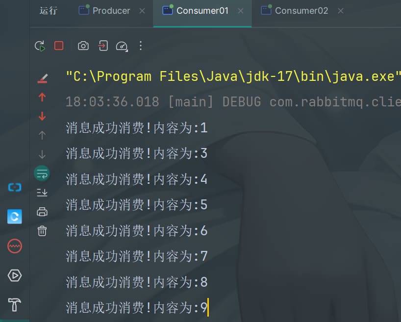 由于consumer01处理速度较快,consumer02处理较慢,所以consumer01处理完5条消息时consumer02还未处理第一条消息,因此后面的7、8、9条消息都会分配给consumer01进行消费。