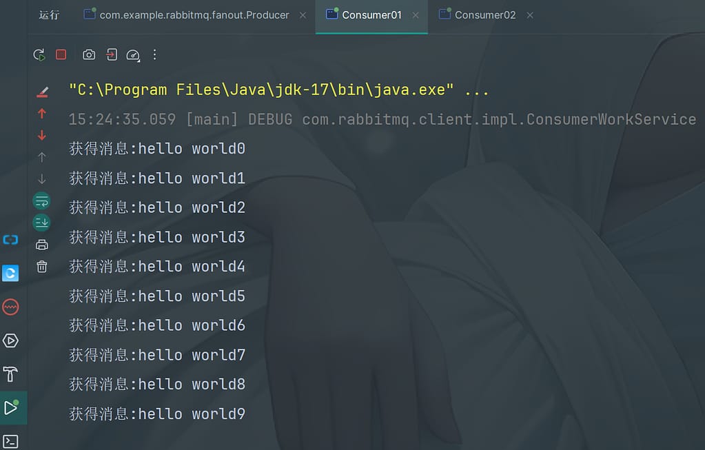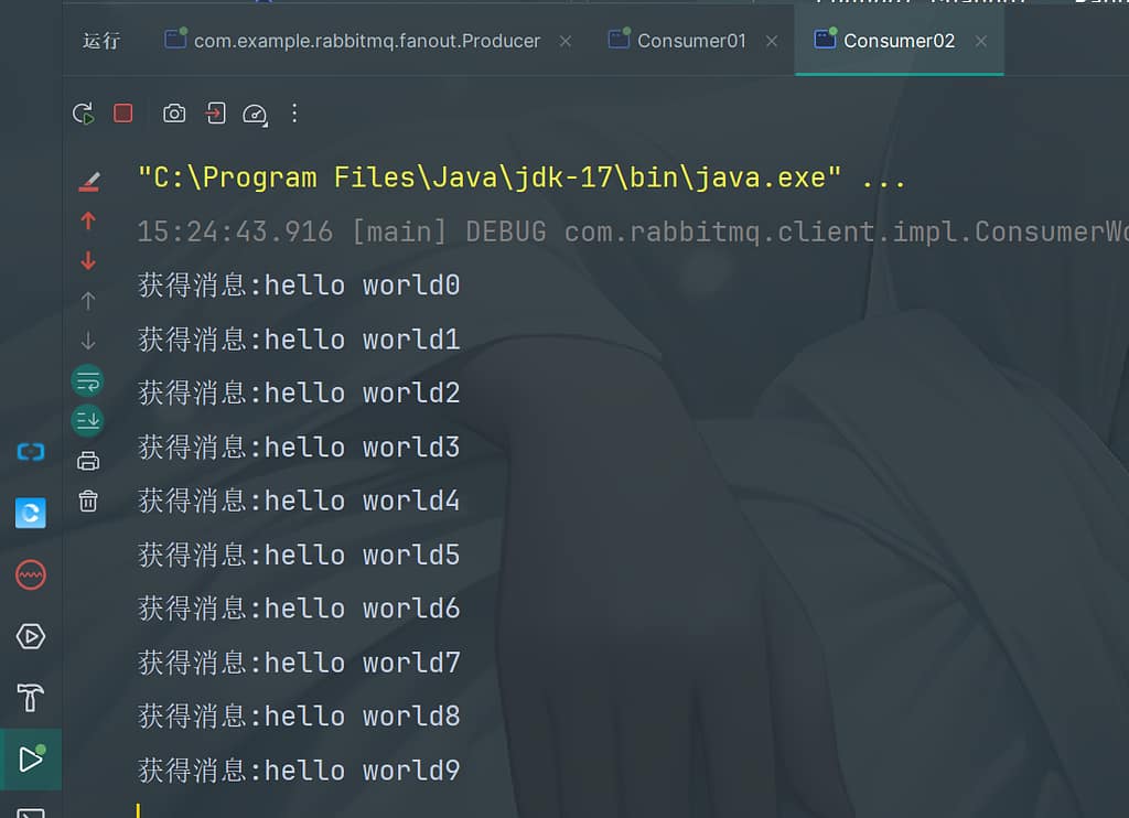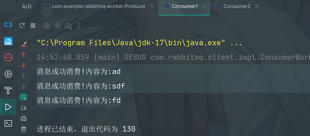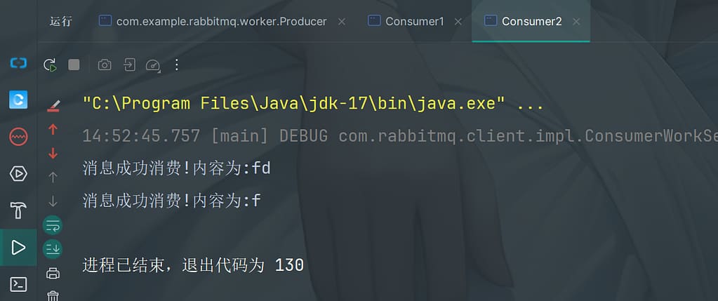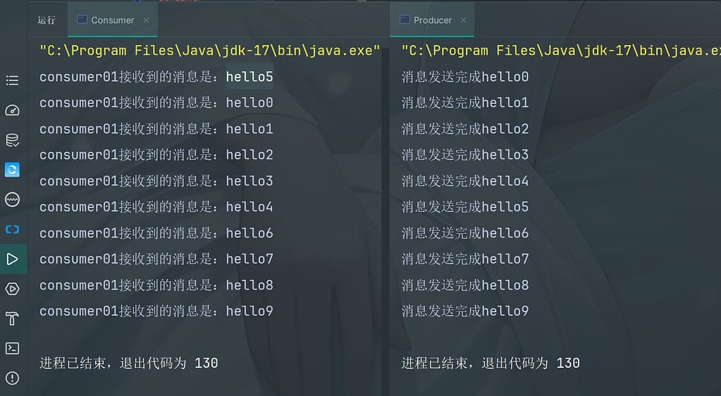 然后再启动消费者,可以看到控制台打印收到的消息,同时可以看到消息已经被消费