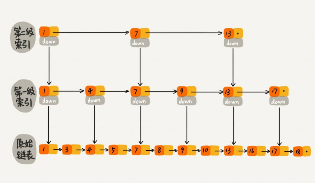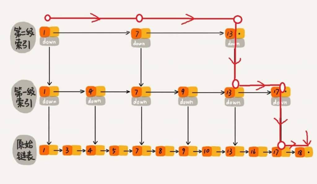 查找 18 的时候原来需要遍历 18 次,现在只需要 7 次即可。针对链表长度比较大的时候,构建索引查找效率的提升就会非常明显。