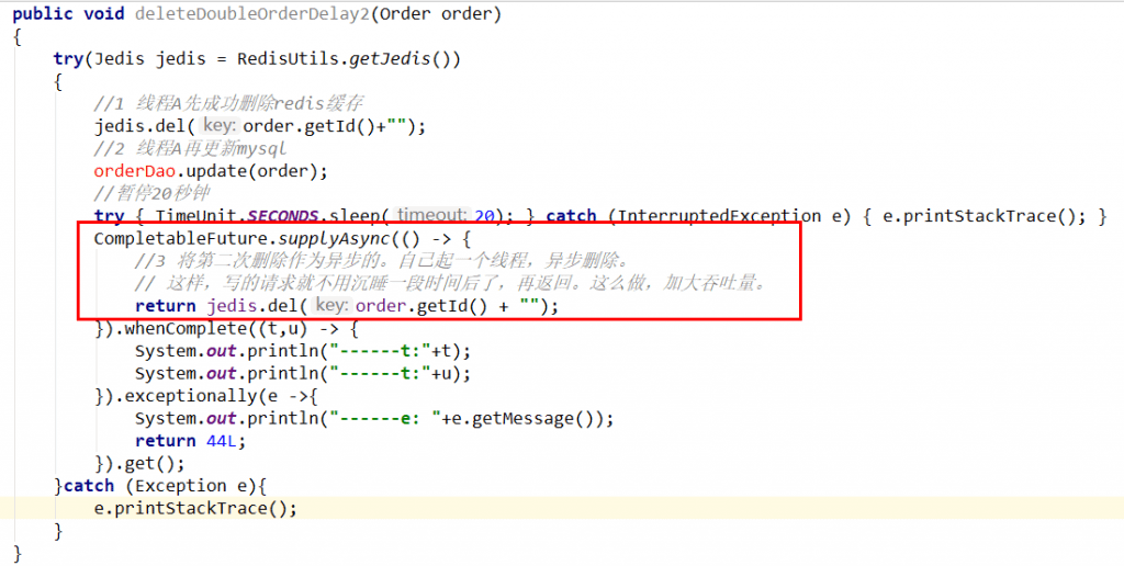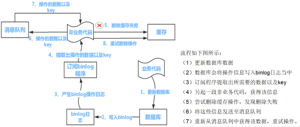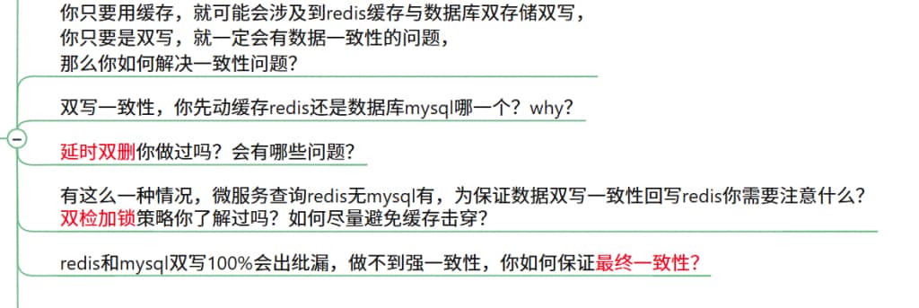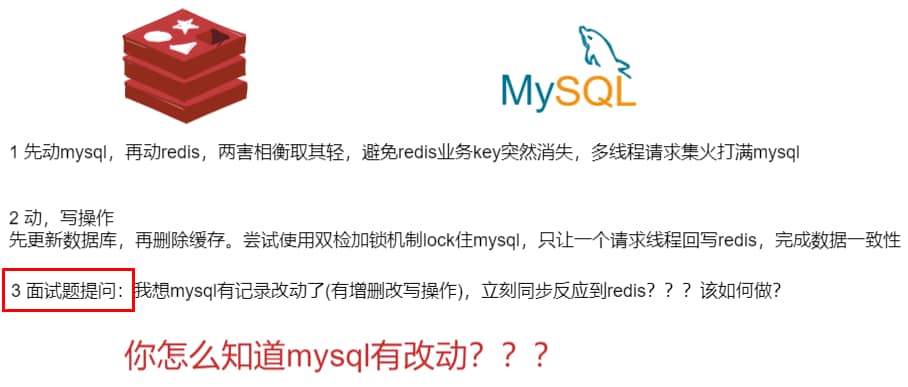 - 异步缓存策略:正常业务中,mysql数据变动了,业务上允许出现一定时间后才作用于redis,比如仓库,物流系统,异常出现了,不得不将失败的动作重补,可能需要借助kafka或者rabbitmq等