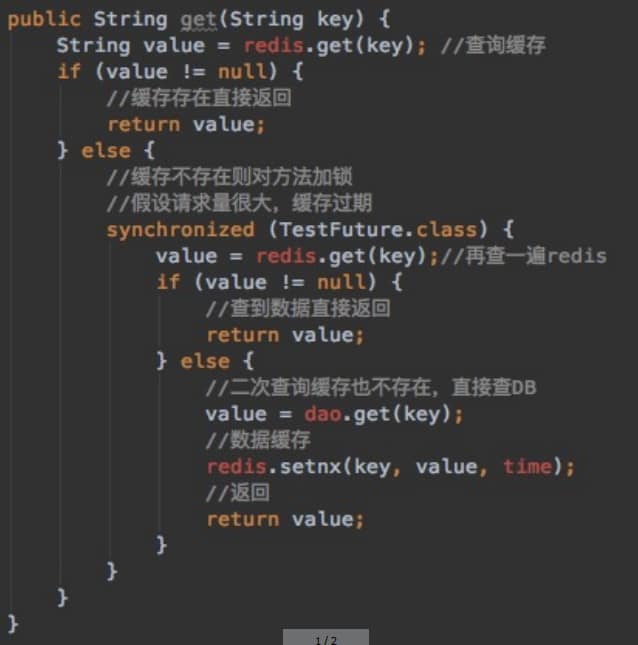 采用双检加锁策略:多个线程同时去查询数据库的这条数据,那么我们可以在第一个查询数据的请求上使用一个 互斥锁来锁住它。其他的线程走到这一步拿不到锁就等着,等第一个线程查询到了数据,然后做缓存。后面的线程进来发现已经有缓存了,就直接走缓存。