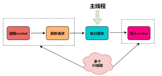 从Redis6开始,就新增了多线程的功能来提高 I/O 的读写性能,他的主要实现思路是将主线程的 IO 读写任务拆分给一组独立的线程去执行,这样就可以使多个 socket 的读写可以并行化了,采用多路 I/O 复用技术可以让单个线程高效的处理多个连接请求(尽量减少网络IO的时间消耗),将最耗时的Socket的读取、请求解析、写入单独外包出去,剩下的命令执行仍然由主线程串行执行并和内存的数据交互。