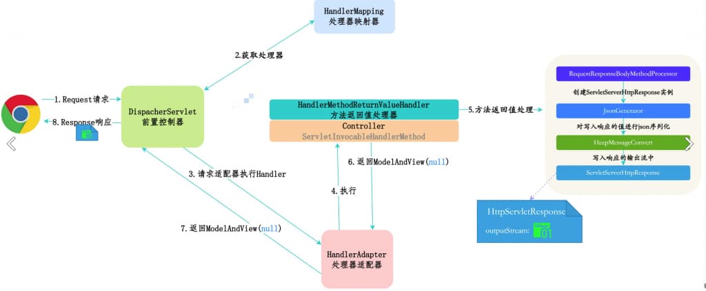 5. HandlerAdapter执行完对Controller的请求,会调用HandlerMethodReturnValueHandler去处理返回值,主要的过程:5.1. 调用RequestResponseBodyMethodProcessor,创建ServletServerHttpResponse(Spring对原生ServerHttpResponse的封装)实例5.2.使用HttpMessageConverter的write方法,将返回值写入ServletServerHttpResponse的OutputStream输出流中5.3.在写入的过程中,会使用JsonGenerator(默认使用Jackson框架)对返回值进行Json序列化