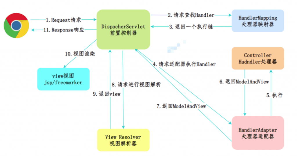 3. HandlerMapping:DispatcherServlet 接收到请求之后,通过 HandlerMapping 将不同的请求映射到不同的 Handler。