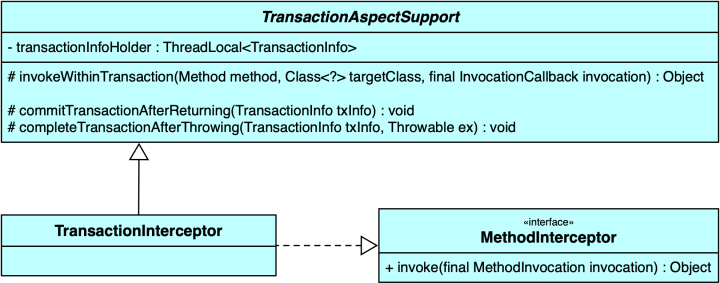• 在执行目标方法时进行事务增强操作:当通过代理对象调用Bean方法的时候,会触发对应的AOP增强拦截器,声明式事务是一种环绕增强,对应接口为MethodInterceptor,事务增强对该接口的实现为TransactionInterceptor,类图如下: