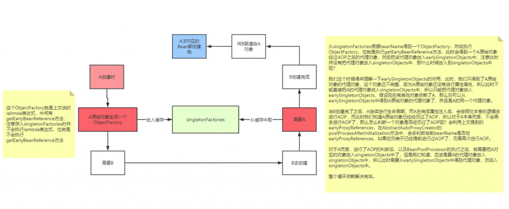 左边文字: 这个ObjectFactory就是上文说的labmda表达式,中间有getEarlyBeanReference方
