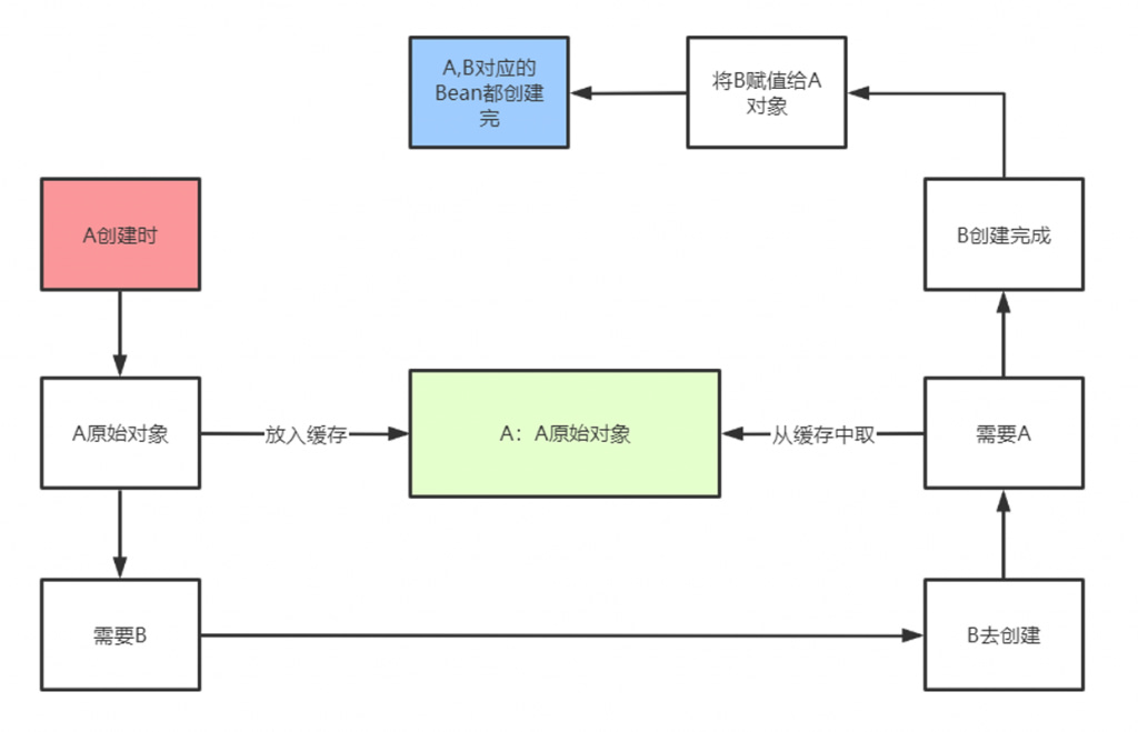 赖注入A,此时能从缓存中拿到A的原始对象(虽然是A的原始对象,还不是最终的Bean),B的原始