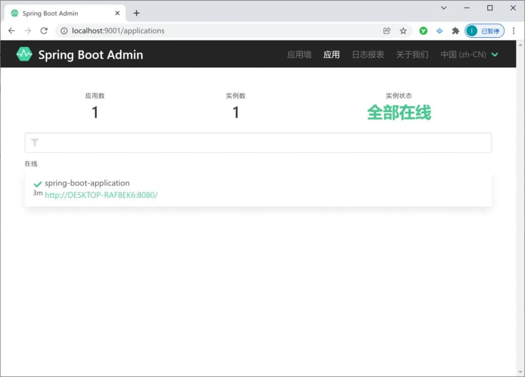 配置完以上信息之后,此时查看 Spring Boot Admin 页面中就有被监控的 Spring Boot 项目了,如下图所示: