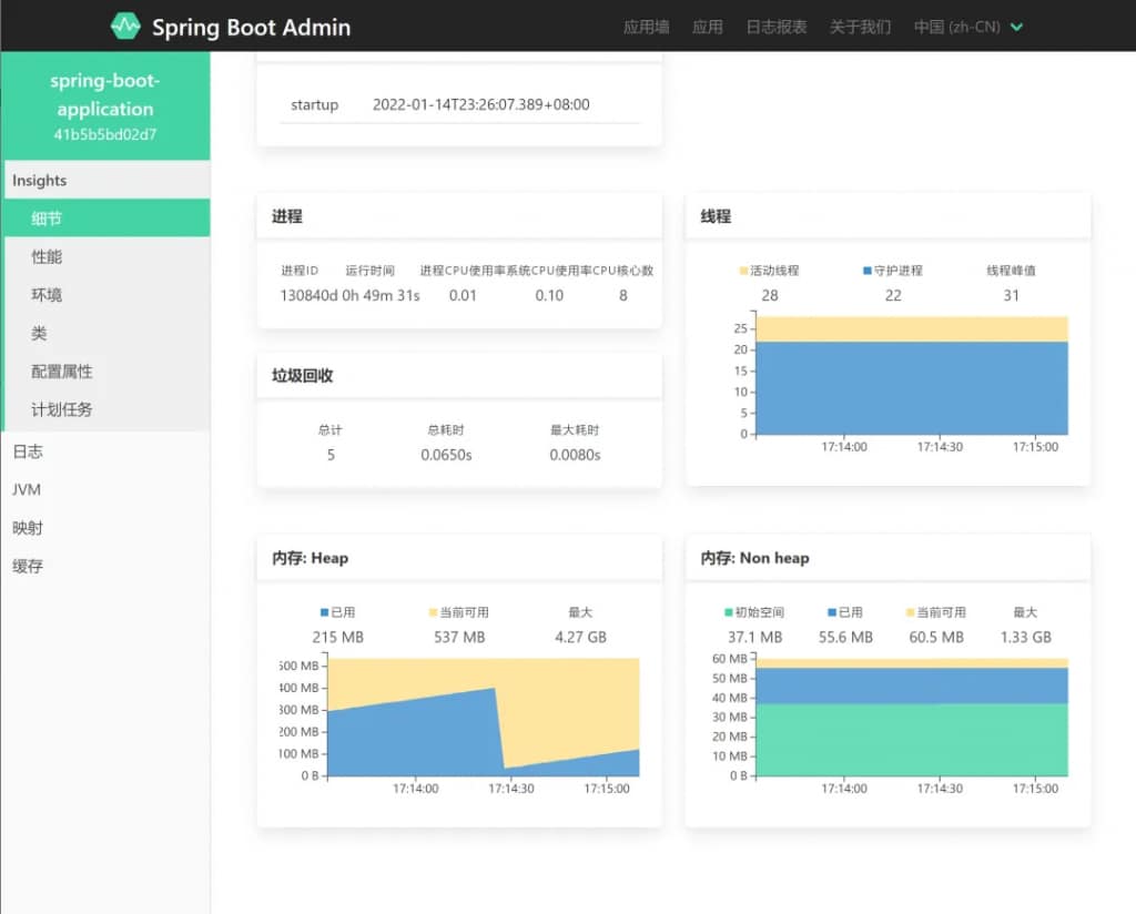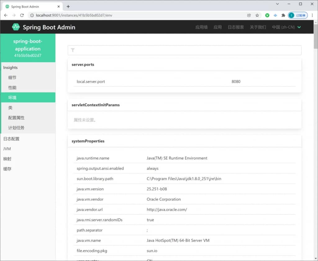 以上的配置是开放监控所有选项,配置完之后,重启此 Spring Boot 项目,然后再刷新 Spring Boot Admin 更多的监控项就展示出来了,如下图所示: