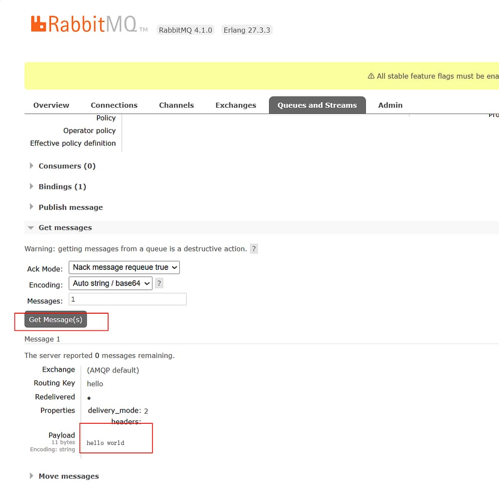 创建一个hello队列,你会发现里面有一条消息
