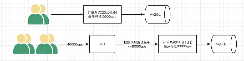 举个例子,假设某订单系统每秒最多能处理一万次订单,也就是最多承受的10000qps,这个处理能力应付正常时段的下单时绰绰有余,正常时段我们下单一秒后就能返回结果。但是在高峰期,如果有两万次下单操作系统是处理不了的,只能限制订单超过一万后不允许用户下单。使用消息队列做缓冲,我们可以取消这个限制,把一秒内下的订单分散成一段时间来处理,这时有些用户可能在下单十几秒后才能收到下单成功的操作,但是比不能下单的体验要好。