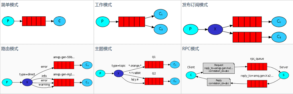 RabbitMQ提供6种模式,分别是 Hello World、Work Queues、Publish/Subscribe、Routing、Topics、RPC。本文详细讲述了前5种,并给出代码实现和思路。其中 Publish/Subscribe、Routing、Topics 三种模式可以统一归为 Exchange 模式,只是创建时交换机的类型不一样,分别是 fanout、direct、topic 三种交换机类型。