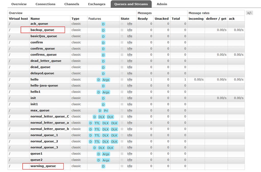 - 队列:队列是 RabbitMQ 内部使用的一种数据结构,尽管消息流经 RabbitMQ 和应用程序,但它们只能存储在队列中。队列仅受主机的内存和磁盘限制的约束,本质上是一个大的消息缓冲区。许多生产者可以将消息发送到一个队列,许多消费者可以尝试从一个队列接收数据。