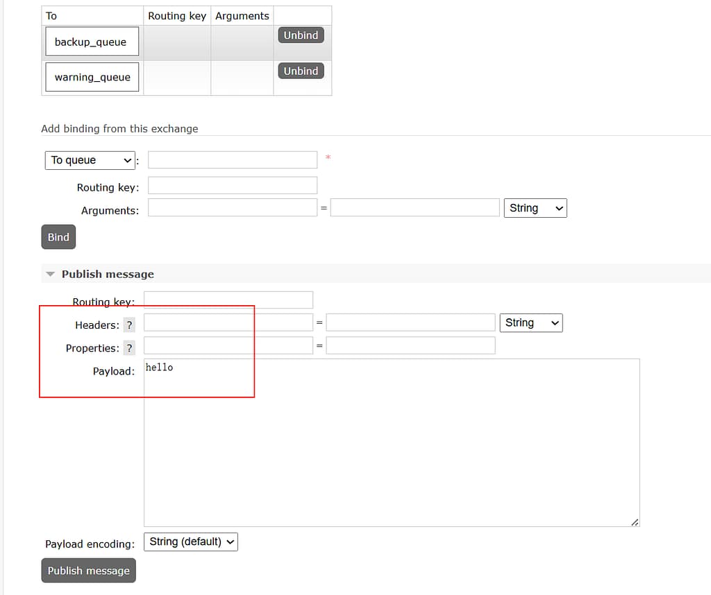 默认交换机,设置路由hello,发送一个消息hello world