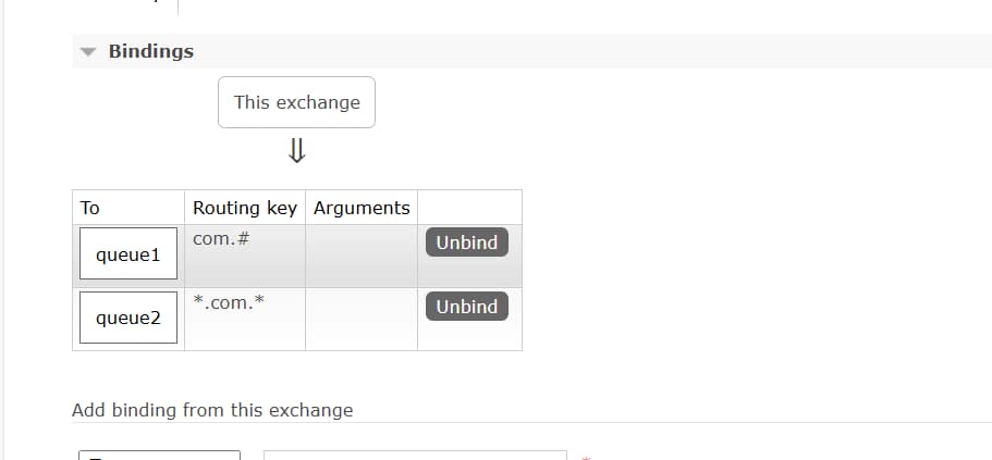 Bindings:exchange 和 queue 之间的虚拟连接,binding 中可以包含 routing key,Binding 信息被保存到 exchange 中的查询表- 中,用于 message 的分发依据。